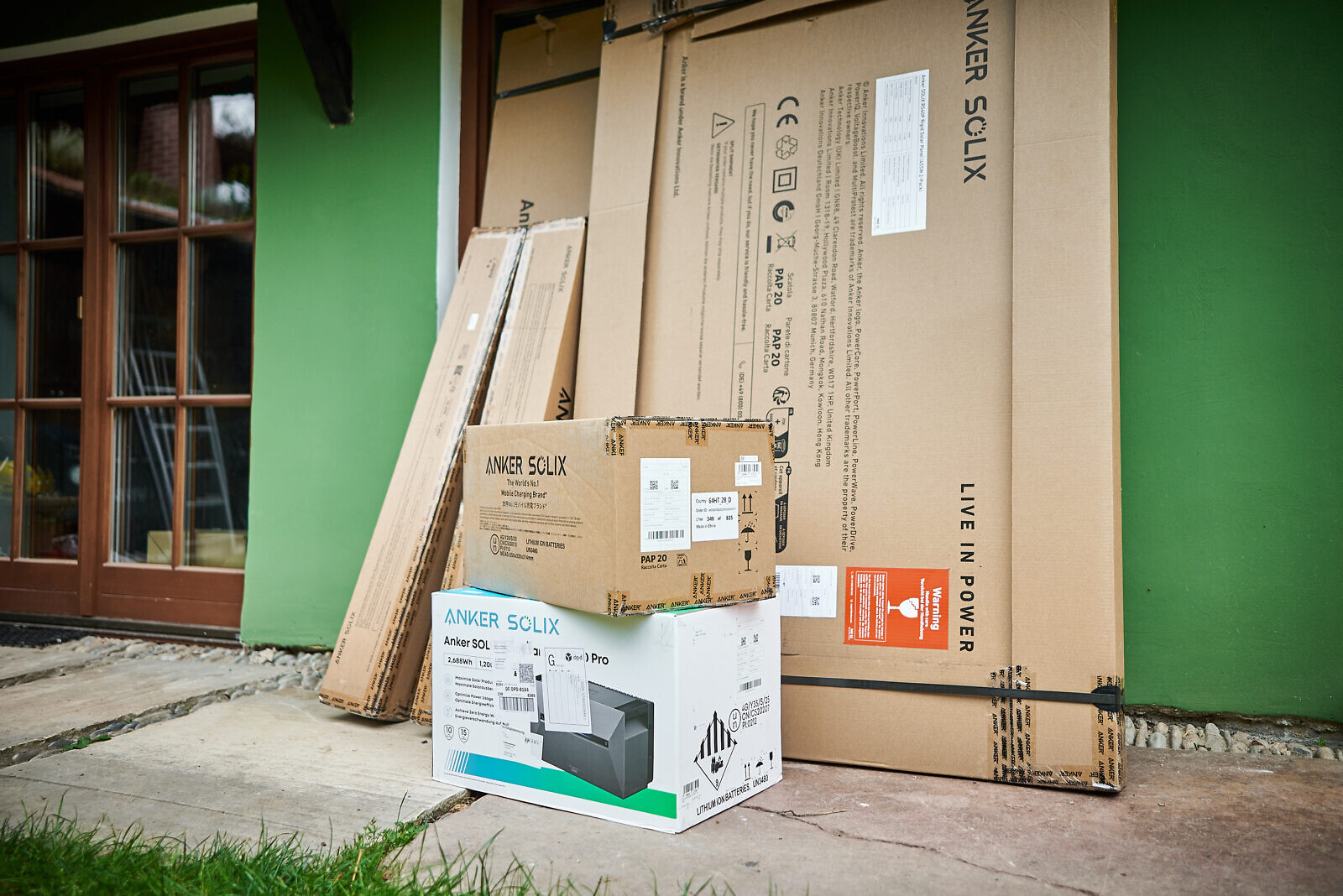 Wir haben das Komplettpaket direkt von Anker Solix bezogen zur Selbstmontage. So schwer soll es ja nicht sein. Das Paket beinhaltet 4 Paneele sowie den Batteriespeicher Solarbank 3 Pro mit einem Erweiterungsakku und dem Montageset für Ziegeldach. Leider habe ich die Kabel und Stecker vergessen mitzubestellen, daher wurden dies als 100 m Rolle separat besorgt.