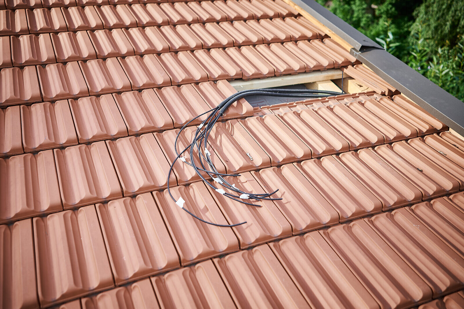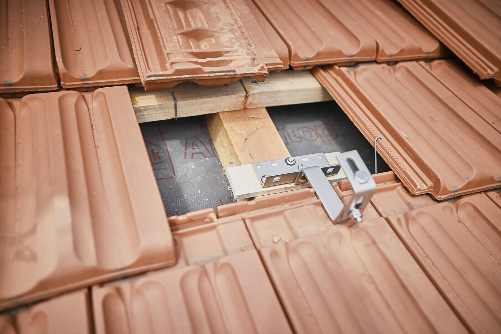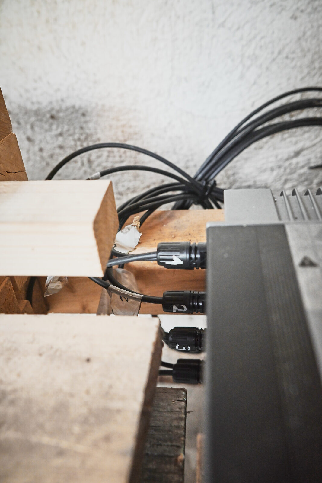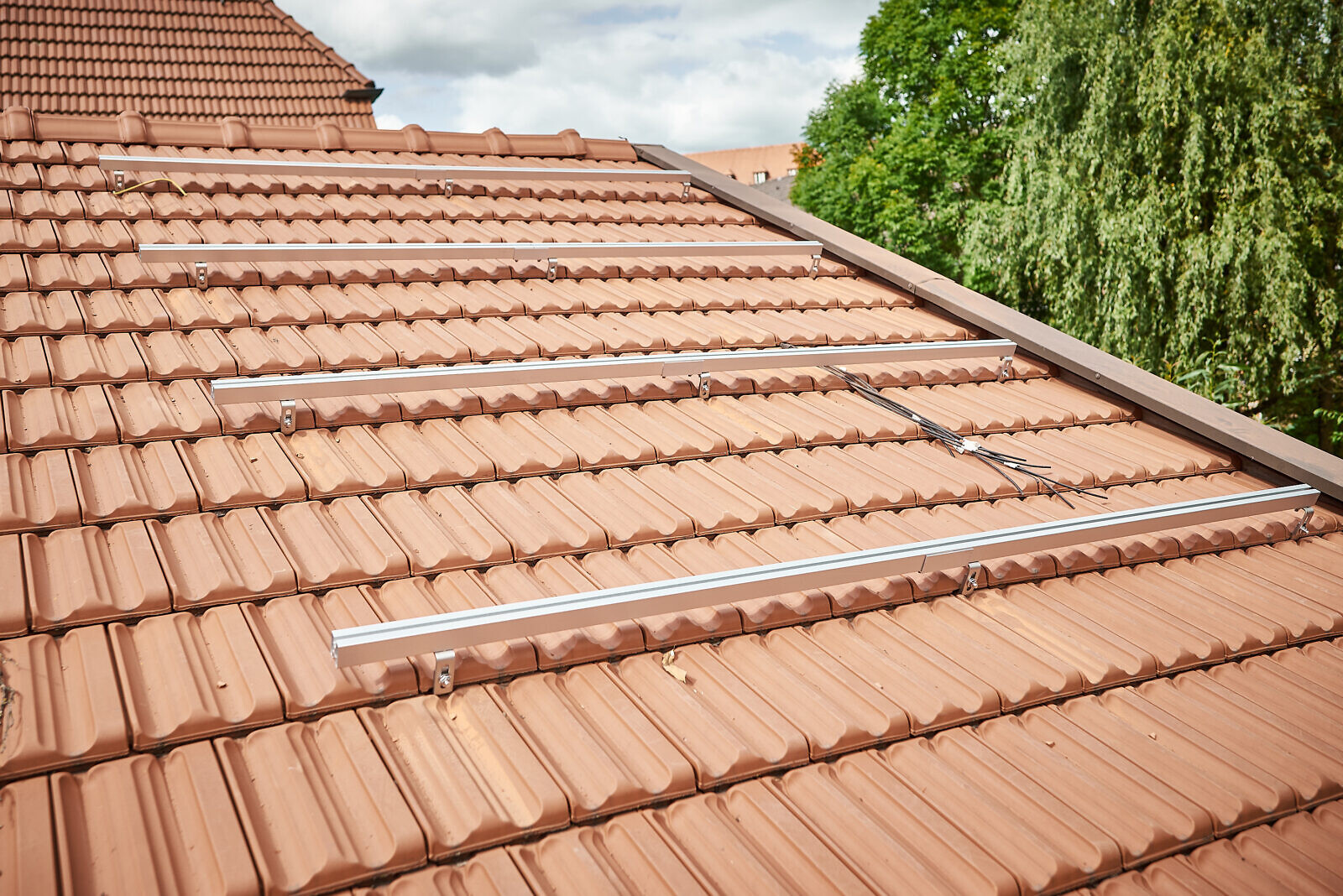 Geliefert wurde alles ordentlich verpackt in vielen einzelnen Paketen. Dort an der Hauswand durfte es auch erstmal stehen bleiben, bis die Halterungen und Leitungen vorbereitet waren. Auch das WLAN musste erst bis zum Unterstand entsprechend verlängert werden.Angefangen wurde mit den Kabeln. 8 Stränge, ordentlich nummeriert. Je 4 pro Leerrohr.Das Leerrohr wird dann unter den Ziegeln verlegt.Dank der recht großen Lattung ist ausreichend Platz vorhanden.Die Leitungen kommen vom Hauptdacht zum Dach vom Unterstand. Dort beginnt später das nächste Leerrohr.Der Auslass im Dach wird vorbereitet. Die Leitungen sollen direkt halbsweg passend lang sein.Nun beginnt der eher anstrengende Teil. Die Befestigung der Harken für die Halterungen. Einzelne Zielgel zu entfernen ist nicht einfach, besonders wenn diese mit Sturmharken sauber fixiert sind.Mit der Flex werden die Ziegel entsprechend angepasst, dass sie den Harken durchlassen und noch etwas Luft nach oben und unten haben.Befestigung der Harken auf der Konterlattung. Hier wurden alle Schrauben und Teile direkt mitgeliefert.Fertige Harken und Ziegel wieder eingesetzt.Der Auslass für die Kabel. Es ist alles auch noch recht staubig, aber das wird der Regen schon richten. Ich habe mich dazu entschieden Plus und Minus jeweils getrennt zu verlegen.Die befestigten Aluprofile. Leider ist unser Dach so abschüzig zur Seite, dass es schwer ist, dies mit den gegebenen Möglichkeiten auszugleichen. Vom Anbringen der Solarstecker ist leider kein Bild vorhanden, aber der Prozess war relativ einfach. Oben war bereits ein Erdungskabel im Dachboden vorhanden, welches später mit einem Lochband über alle Profile verteilt ist.Die fertigen Paneele. Jetzt braucht es nur noch Sonne.Nun müssen die Leitungen ordentlich nach unten verlegt werden. Weitere Leerrohre kommen zum Einsatz. Dieses Stück kann ich leider nicht richtig verstecken.Der Batteriespeicher steht draußen im trockenen Unterstand. Dank einer alten Starkstromleitung konnte dieser auf einer eigenen Sicherung mit eigener Leitung am Hausnetz angeschlossen werden.Noch sind die Kabel recht lang gehalten. Es kann sein, dass sich der Platz noch einmal verändert, wenn erstmal das restliche Bauholz verbaut ist.Die Nummerierung der Kabel wurde ordentlich auf die Stecker übertragen. Ich befürchte eines Tages werde ich dies noch einmal benötigen.