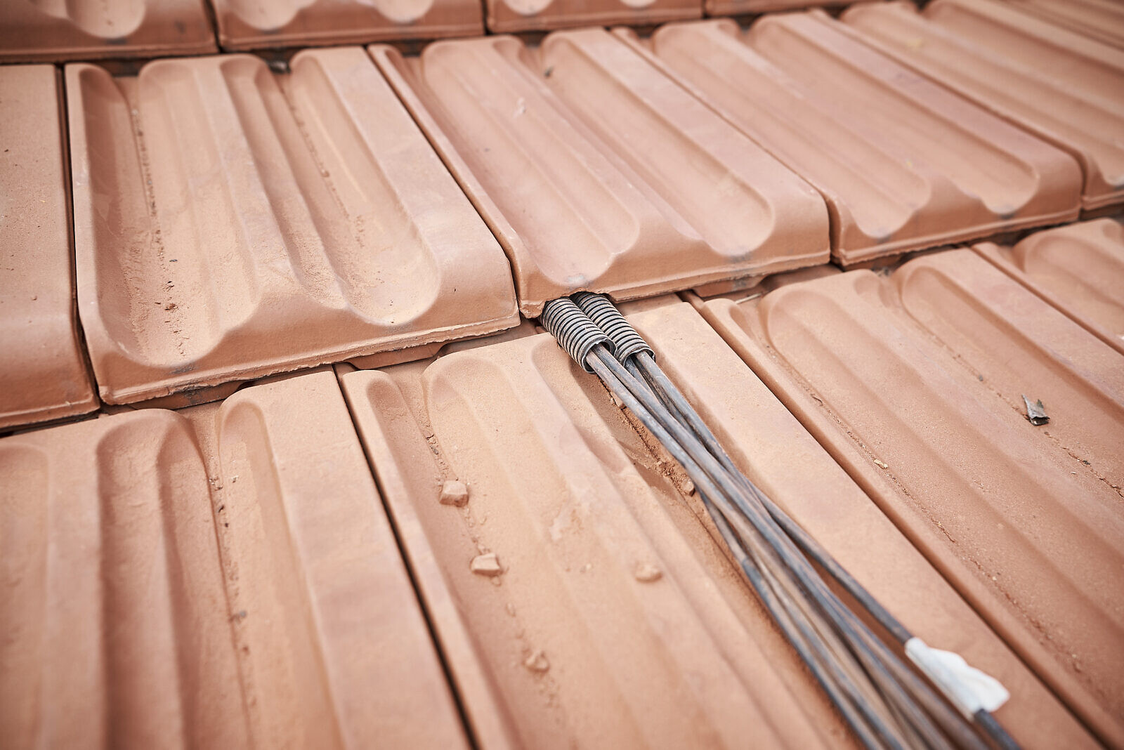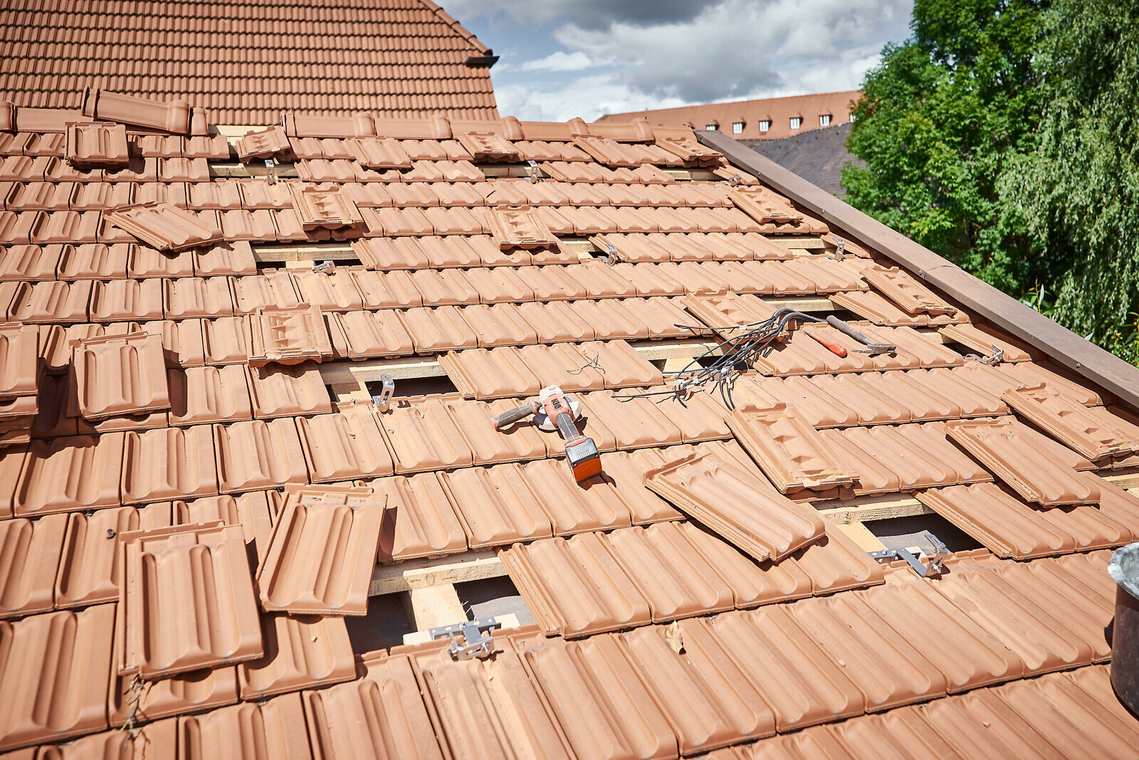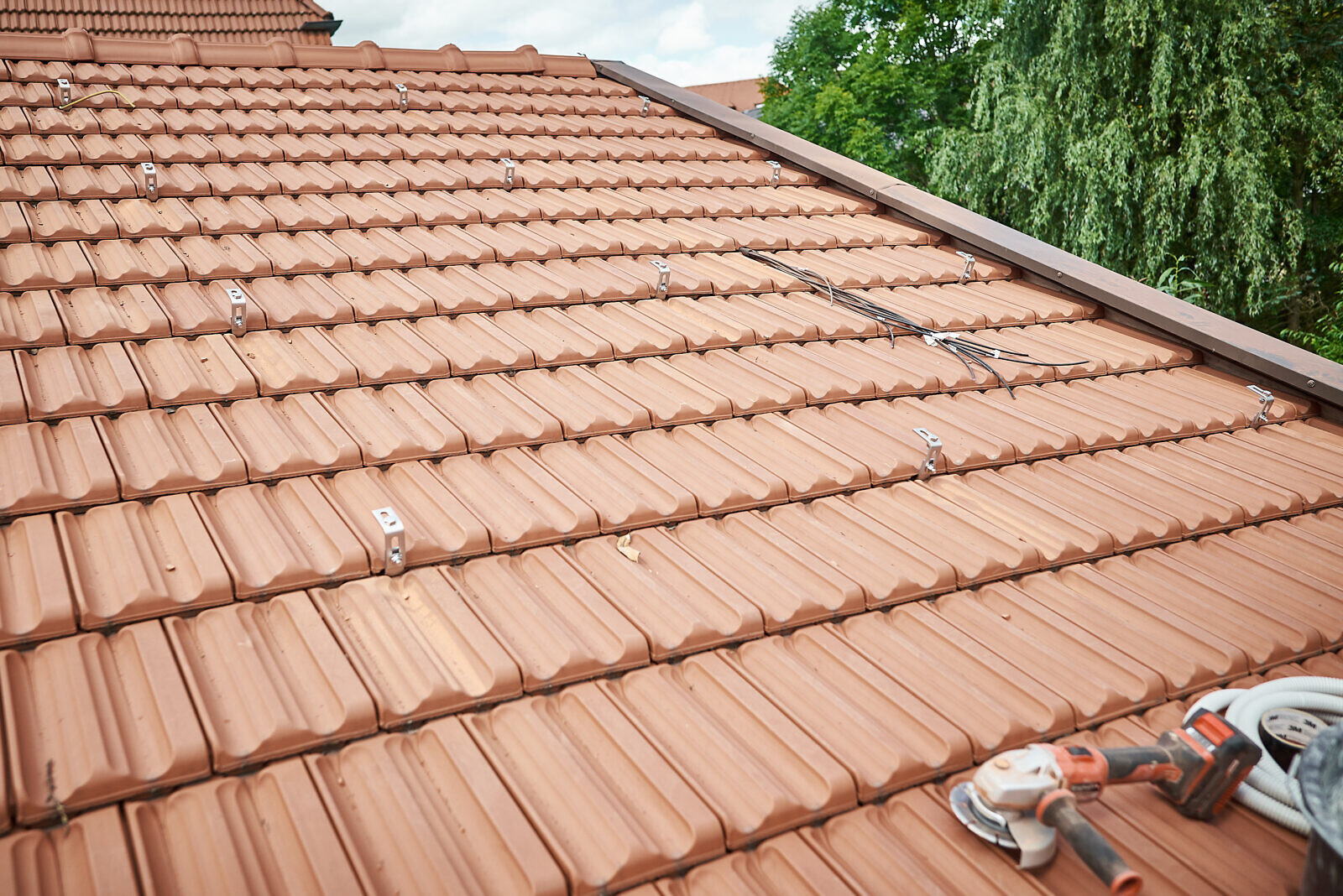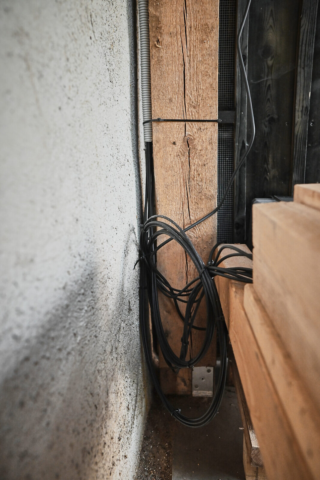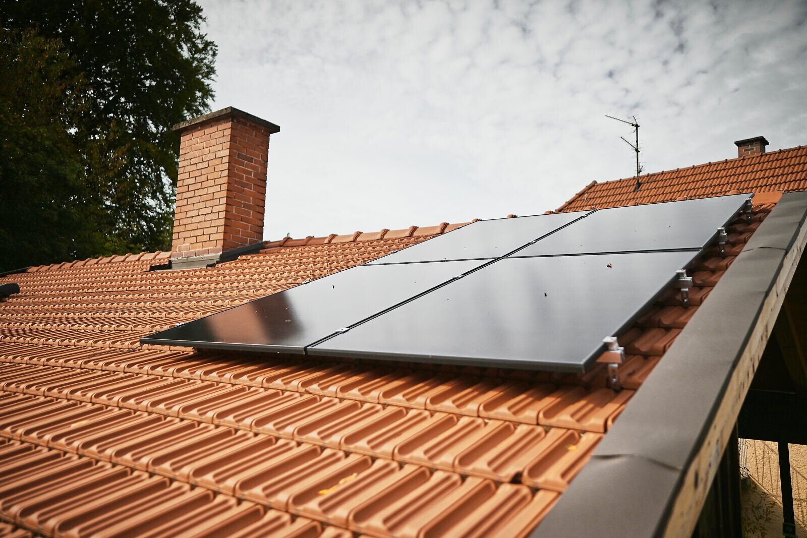 Geliefert wurde alles ordentlich verpackt in vielen einzelnen Paketen. Dort an der Hauswand durfte es auch erstmal stehen bleiben, bis die Halterungen und Leitungen vorbereitet waren. Auch das WLAN musste erst bis zum Unterstand entsprechend verlängert werden.Angefangen wurde mit den Kabeln. 8 Stränge, ordentlich nummeriert. Je 4 pro Leerrohr.Das Leerrohr wird dann unter den Ziegeln verlegt.Dank der recht großen Lattung ist ausreichend Platz vorhanden.Die Leitungen kommen vom Hauptdacht zum Dach vom Unterstand. Dort beginnt später das nächste Leerrohr.Der Auslass im Dach wird vorbereitet. Die Leitungen sollen direkt halbsweg passend lang sein.Nun beginnt der eher anstrengende Teil. Die Befestigung der Harken für die Halterungen. Einzelne Zielgel zu entfernen ist nicht einfach, besonders wenn diese mit Sturmharken sauber fixiert sind.Mit der Flex werden die Ziegel entsprechend angepasst, dass sie den Harken durchlassen und noch etwas Luft nach oben und unten haben.Befestigung der Harken auf der Konterlattung. Hier wurden alle Schrauben und Teile direkt mitgeliefert.Fertige Harken und Ziegel wieder eingesetzt.Der Auslass für die Kabel. Es ist alles auch noch recht staubig, aber das wird der Regen schon richten. Ich habe mich dazu entschieden Plus und Minus jeweils getrennt zu verlegen.Die befestigten Aluprofile. Leider ist unser Dach so abschüzig zur Seite, dass es schwer ist, dies mit den gegebenen Möglichkeiten auszugleichen. Vom Anbringen der Solarstecker ist leider kein Bild vorhanden, aber der Prozess war relativ einfach. Oben war bereits ein Erdungskabel im Dachboden vorhanden, welches später mit einem Lochband über alle Profile verteilt ist.Die fertigen Paneele. Jetzt braucht es nur noch Sonne.Nun müssen die Leitungen ordentlich nach unten verlegt werden. Weitere Leerrohre kommen zum Einsatz. Dieses Stück kann ich leider nicht richtig verstecken.Der Batteriespeicher steht draußen im trockenen Unterstand. Dank einer alten Starkstromleitung konnte dieser auf einer eigenen Sicherung mit eigener Leitung am Hausnetz angeschlossen werden.Noch sind die Kabel recht lang gehalten. Es kann sein, dass sich der Platz noch einmal verändert, wenn erstmal das restliche Bauholz verbaut ist.Die Nummerierung der Kabel wurde ordentlich auf die Stecker übertragen. Ich befürchte eines Tages werde ich dies noch einmal benötigen.