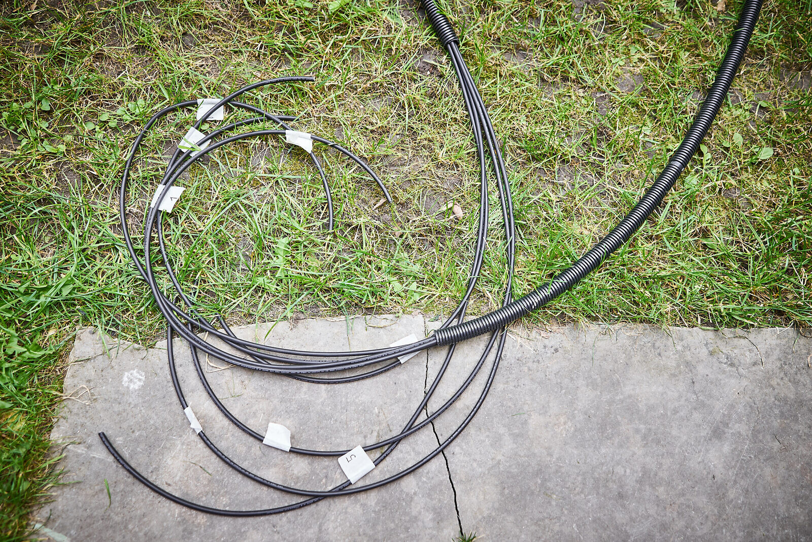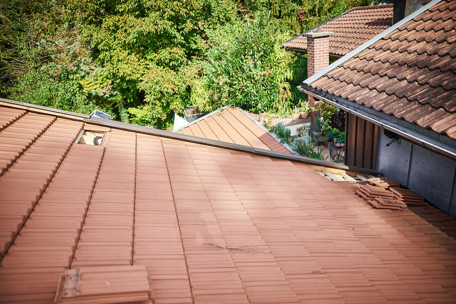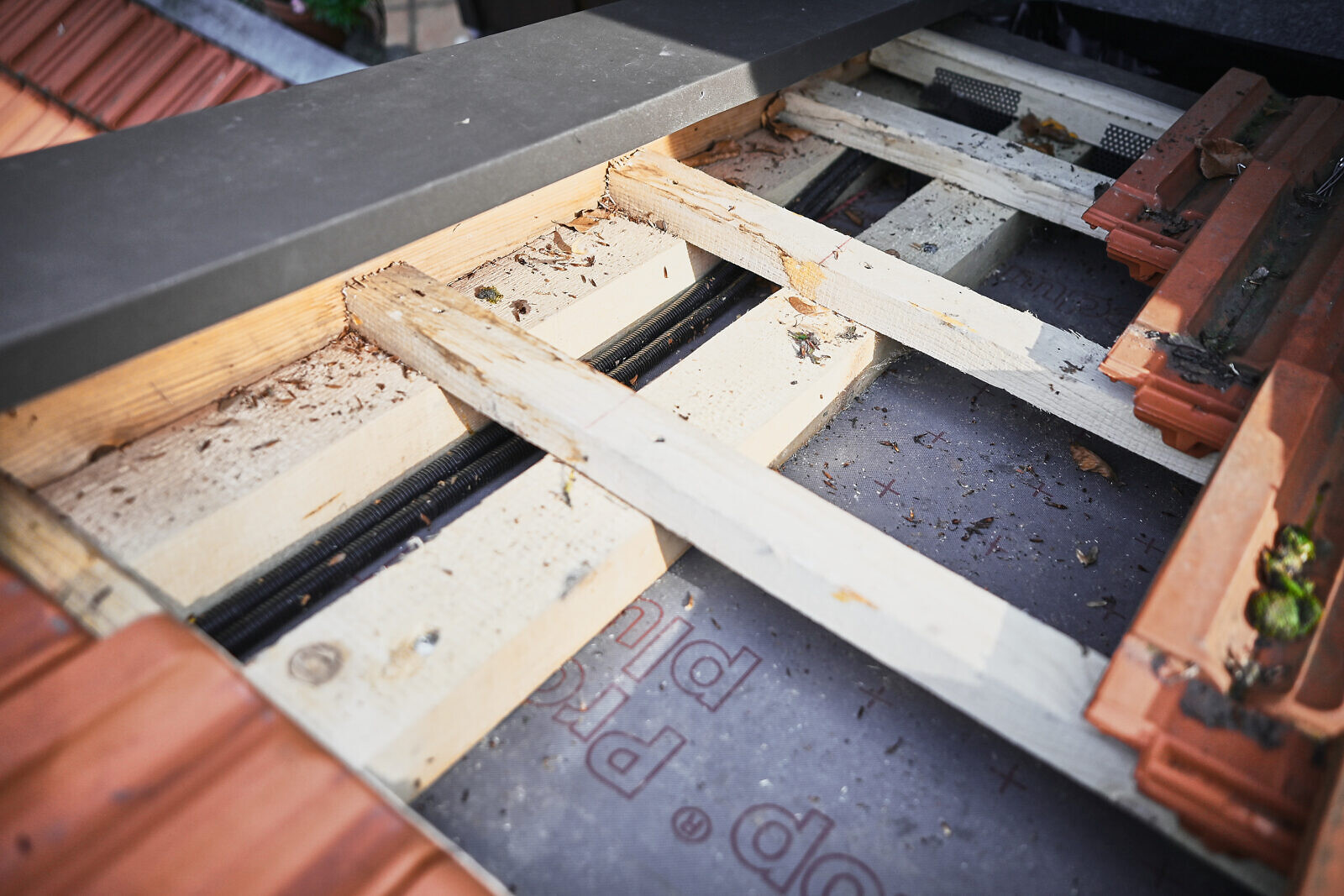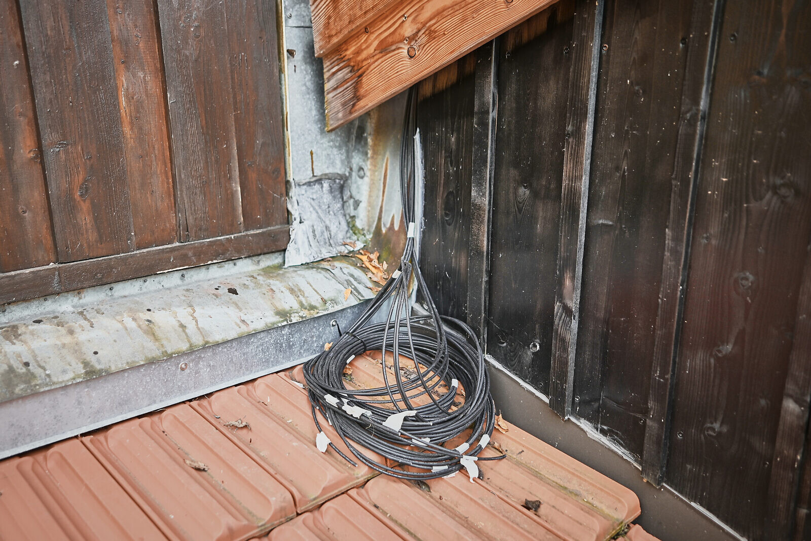 Geliefert wurde alles ordentlich verpackt in vielen einzelnen Paketen. Dort an der Hauswand durfte es auch erstmal stehen bleiben, bis die Halterungen und Leitungen vorbereitet waren. Auch das WLAN musste erst bis zum Unterstand entsprechend verlängert werden.Angefangen wurde mit den Kabeln. 8 Stränge, ordentlich nummeriert. Je 4 pro Leerrohr.Das Leerrohr wird dann unter den Ziegeln verlegt.Dank der recht großen Lattung ist ausreichend Platz vorhanden.Die Leitungen kommen vom Hauptdacht zum Dach vom Unterstand. Dort beginnt später das nächste Leerrohr.Der Auslass im Dach wird vorbereitet. Die Leitungen sollen direkt halbsweg passend lang sein.Nun beginnt der eher anstrengende Teil. Die Befestigung der Harken für die Halterungen. Einzelne Zielgel zu entfernen ist nicht einfach, besonders wenn diese mit Sturmharken sauber fixiert sind.Mit der Flex werden die Ziegel entsprechend angepasst, dass sie den Harken durchlassen und noch etwas Luft nach oben und unten haben.Befestigung der Harken auf der Konterlattung. Hier wurden alle Schrauben und Teile direkt mitgeliefert.Fertige Harken und Ziegel wieder eingesetzt.Der Auslass für die Kabel. Es ist alles auch noch recht staubig, aber das wird der Regen schon richten. Ich habe mich dazu entschieden Plus und Minus jeweils getrennt zu verlegen.Die befestigten Aluprofile. Leider ist unser Dach so abschüzig zur Seite, dass es schwer ist, dies mit den gegebenen Möglichkeiten auszugleichen. Vom Anbringen der Solarstecker ist leider kein Bild vorhanden, aber der Prozess war relativ einfach. Oben war bereits ein Erdungskabel im Dachboden vorhanden, welches später mit einem Lochband über alle Profile verteilt ist.Die fertigen Paneele. Jetzt braucht es nur noch Sonne.Nun müssen die Leitungen ordentlich nach unten verlegt werden. Weitere Leerrohre kommen zum Einsatz. Dieses Stück kann ich leider nicht richtig verstecken.Der Batteriespeicher steht draußen im trockenen Unterstand. Dank einer alten Starkstromleitung konnte dieser auf einer eigenen Sicherung mit eigener Leitung am Hausnetz angeschlossen werden.Noch sind die Kabel recht lang gehalten. Es kann sein, dass sich der Platz noch einmal verändert, wenn erstmal das restliche Bauholz verbaut ist.Die Nummerierung der Kabel wurde ordentlich auf die Stecker übertragen. Ich befürchte eines Tages werde ich dies noch einmal benötigen.